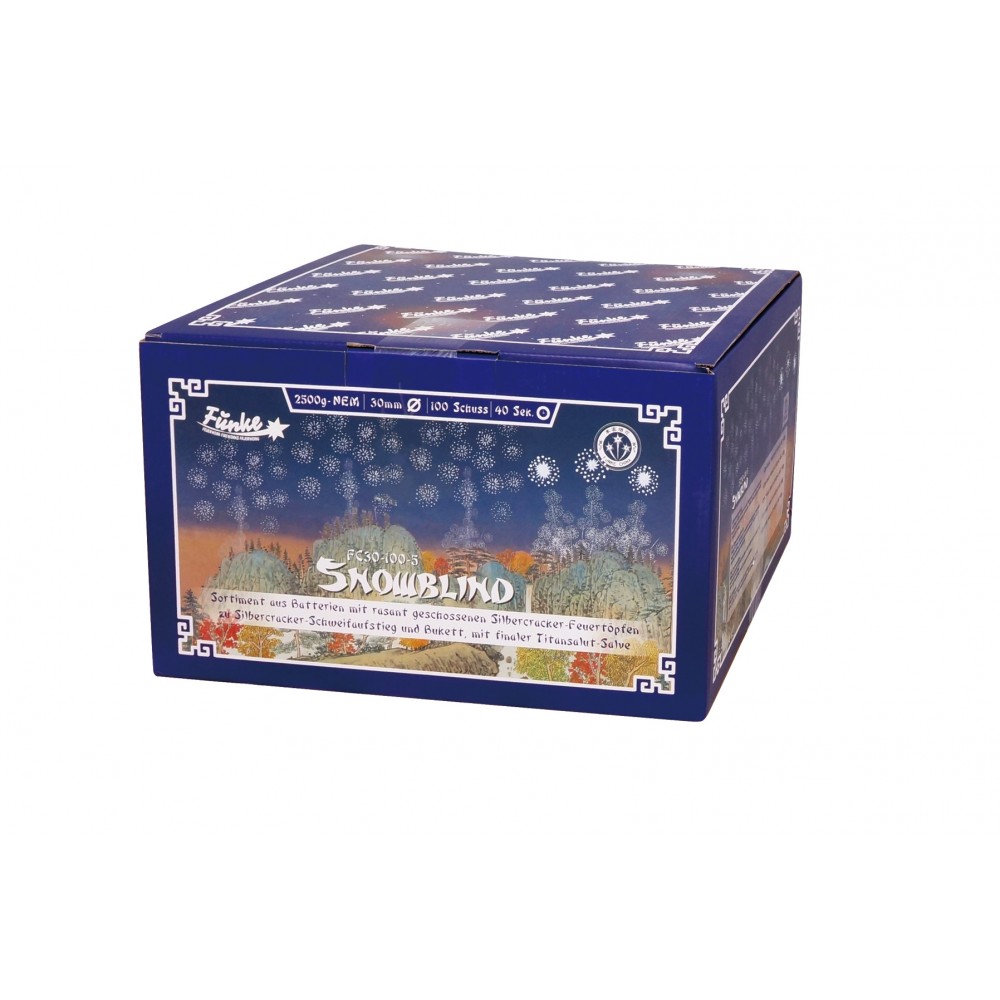 Sortiment aus Batterien mit rasant geschossenen Silbercracker-Feuertöpfen zu Silbercracker-Schweifaufstieg und Bukett, mit finaler Titansalut-Salve.