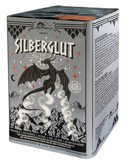 Effektbeschreibung: Tieftonsilberpfeifaufstieg zu Silbercrackerbukets mit Rotblinkern & Finalsalve aus Titansaluts.